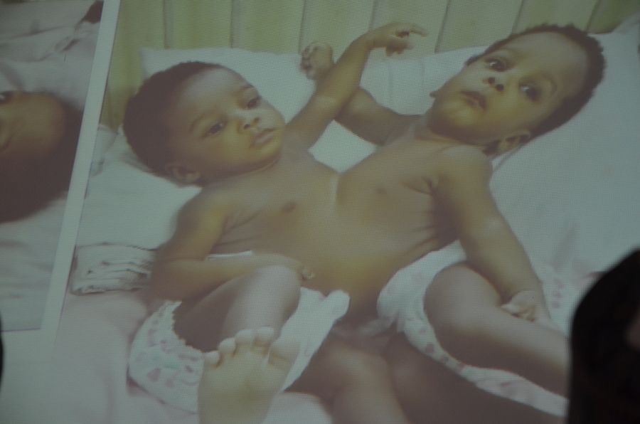 A picture of the conjoined twins before operation is showed at a press conference announcing successful seperation of them at a hospital in Abuja, on January 7, 2020. (photo by Olatunji Obasa/Xinhua)