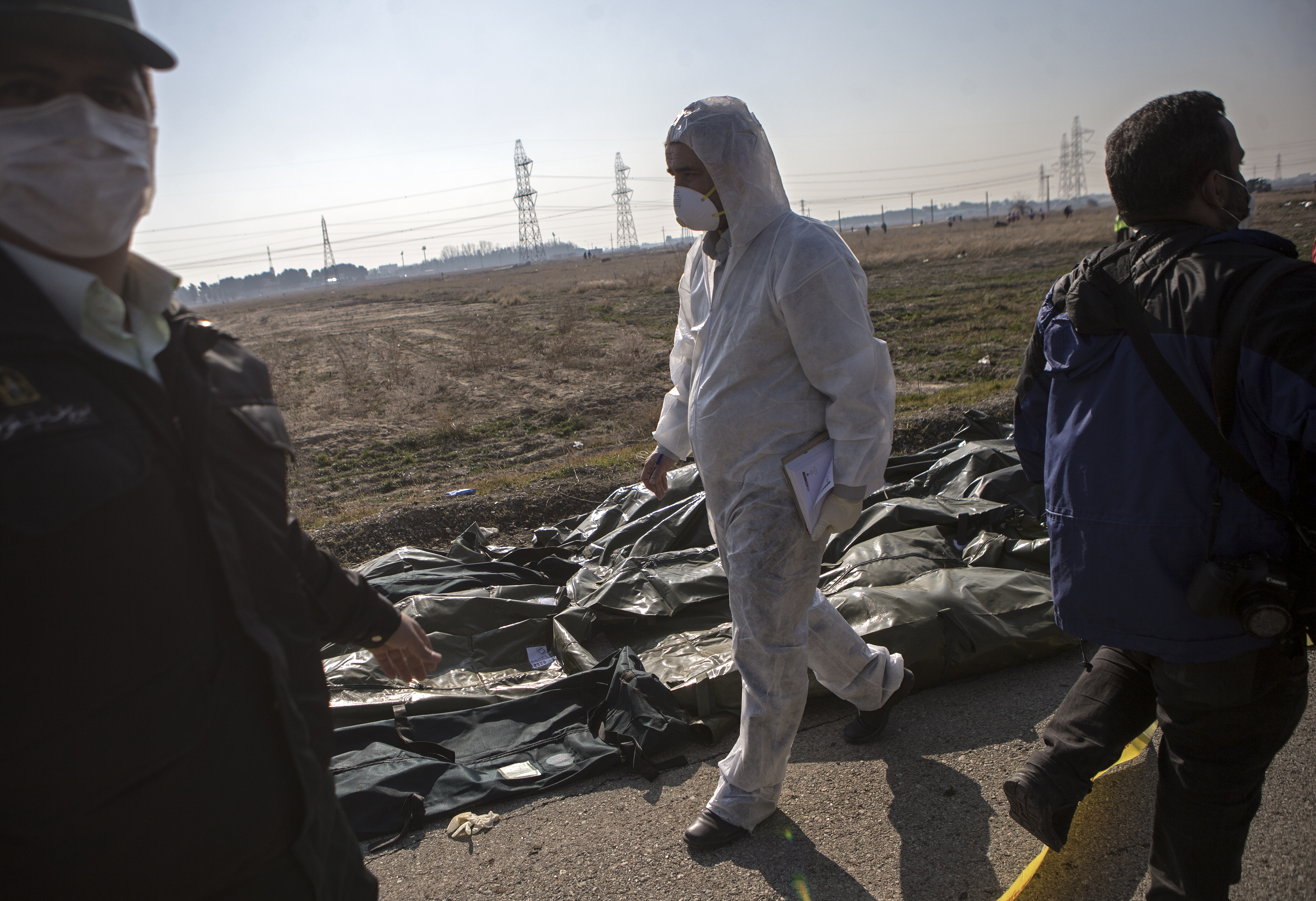 Bodies of victims are seen at the air crash site of a Boeing 737 Ukrainian passenger plane in Parand district, southern Tehran, Iran, on Jan. 8, 2020. (Photo by Ahmad Halabisaz/Xinhua)