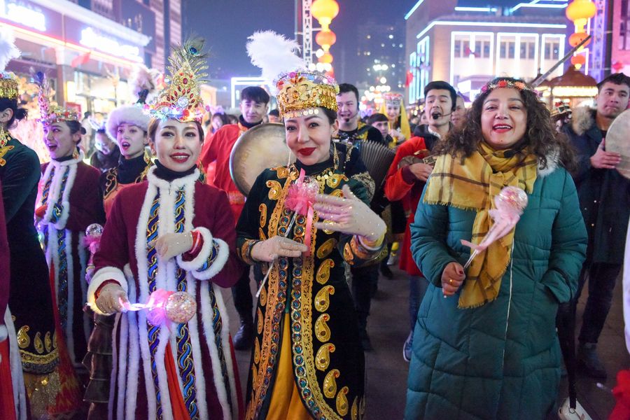 A performance is held at the Xinjiang International Grand Bazaar to celebrate the New Year in Urumqi, northwest China's Xinjiang Uygur Autonomous Region, Dec. 31, 2019. (Xinhua/Ding Lei)