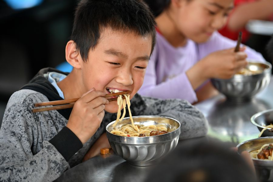 Students have lunch at Dingfan Primary School in Gaocun Township of Wanrong County, north China's Shanxi Province, May 16, 2019. Most of them are left-behind children, whose parents are working in towns or cities. (Xinhua/Cao Yang)