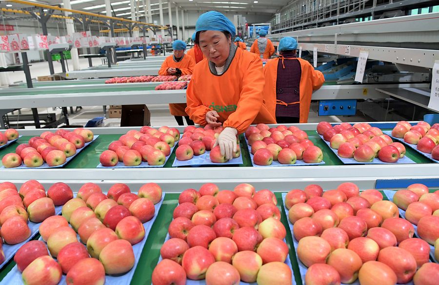 Staff members sort apples at a company in Shangge Township of Luoning County, central China's Henan Province, Oct. 14, 2019. Luoning County has been committed to developing apple planting industry, as a way to help local farmers lift out of poverty. (Xinhua/Li An)