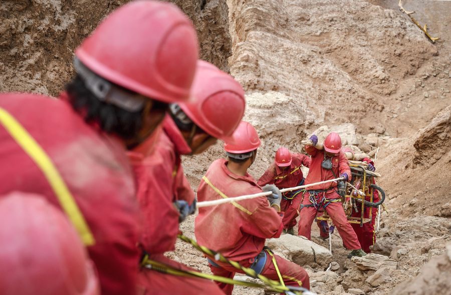 Workers have to carry the digging machines to the mountains.(Xinhua/Gu Yu)