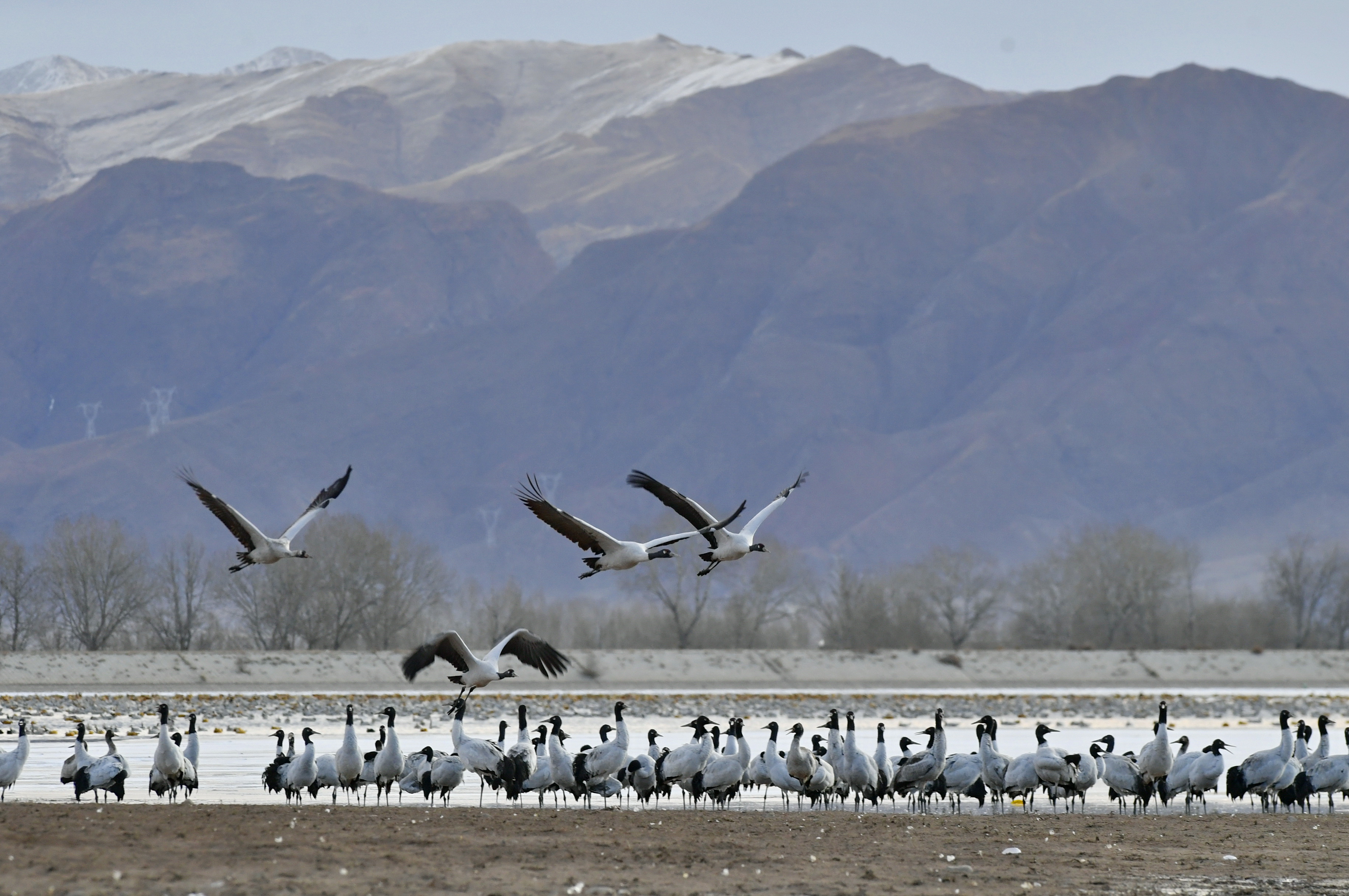 Black-necked cranes are seen at a reservoir in Lhunzhub County, Lhasa, southwest China's Tibet Autonomous Region, Jan. 5, 2020. (Xinhua/Zhang Rufeng)
