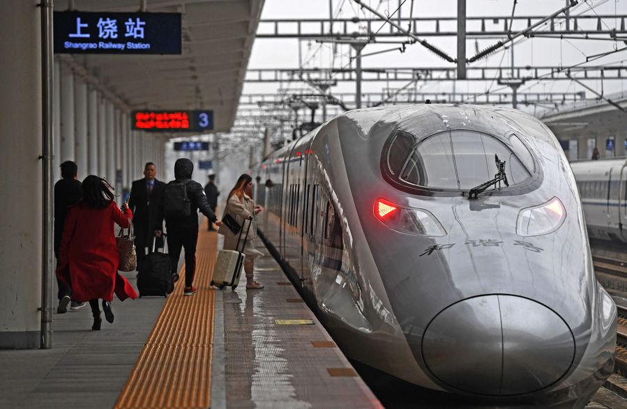 Passengers board the high-speed train at the train station in Shangrao, east China's Jiangxi Province, Jan. 10, 2020. (Xinhua/Wan Xiang)
