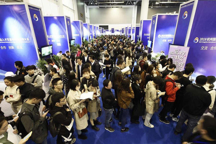 Job applicants are seen at the 2018 Hangzhou International Human Resources Exchanges and Cooperation Conference in Hangzhou, east China's Zhejiang Province, Nov. 10, 2018. (Xinhua/Li Zhong)