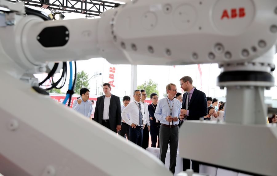 Guests talk with each other during the groundbreaking ceremony of ABB Robotics Factory of the Future in Shanghai, east China, Sept. 12, 2019. (Xinhua/Fang Zhe)