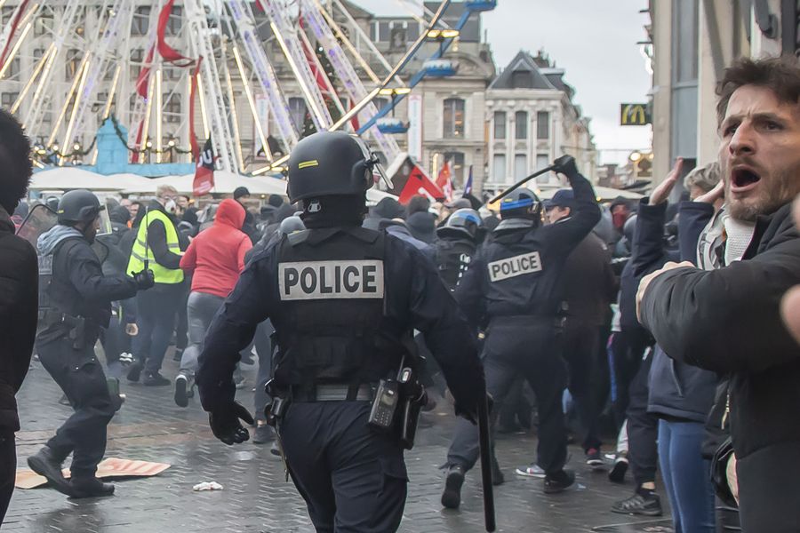 A protestor confronts policemen during a demonstration against pension reform in Lille, north France, Jan. 9, 2020. (Photo by Sebastien Courdji/Xinhua)