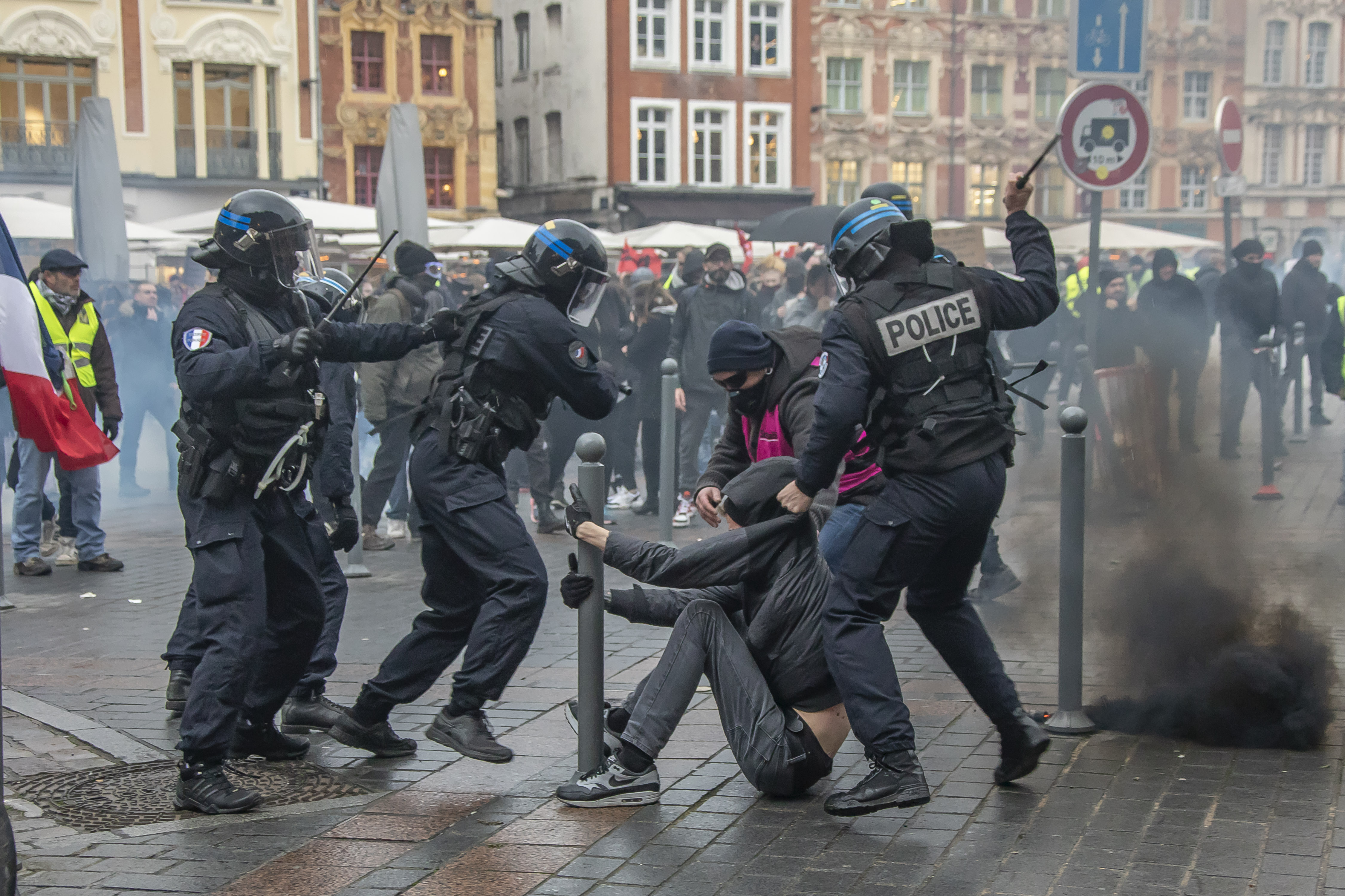 Policemen disperse demonstrators during a demonstration against pension reform in Lille, north France, Jan. 9, 2020. (Photo by Sebastien Courdji/Xinhua)