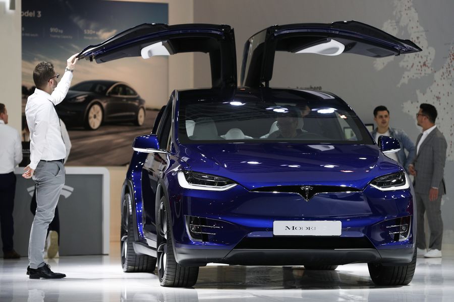 A staff member touches the falcon-wing door of a Tesla Model X electric car at the 98th Brussels Motor Show in Brussels, Belgium, Jan. 9, 2020.(Xinhua/Zheng Huansong)