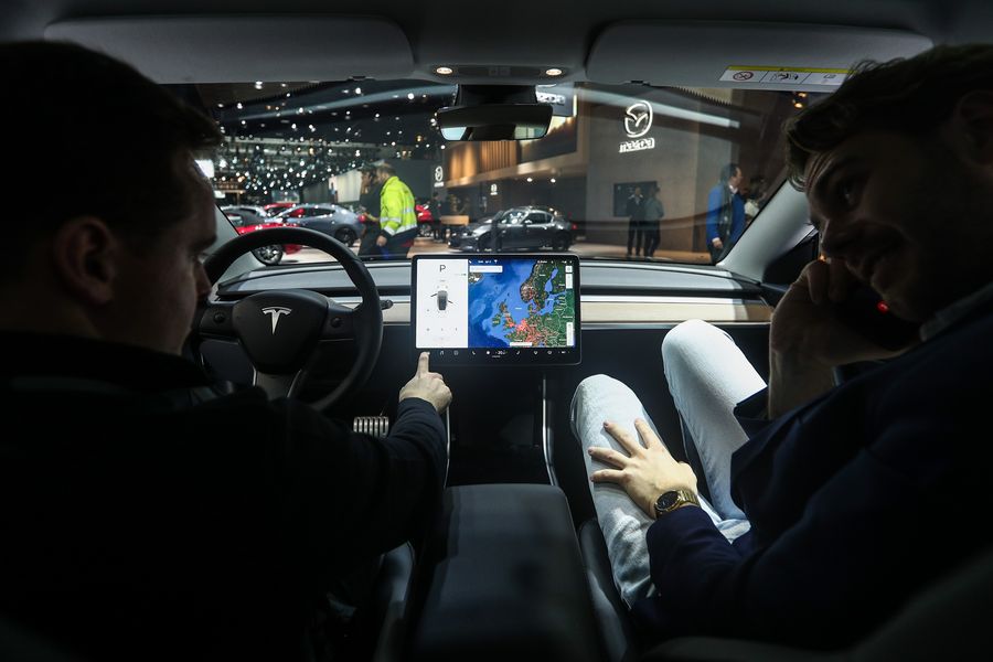 People experience a Tesla Model 3 electric car at the 98th Brussels Motor Show in Brussels, Belgium, Jan. 9, 2020.(Xinhua/Zheng Huansong)