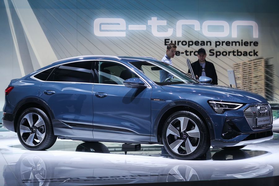 An Audi e-tron sportback car is seen at the 98th Brussels Motor Show in Brussels, Belgium, Jan. 9, 2020.(Xinhua/Zheng Huansong)■