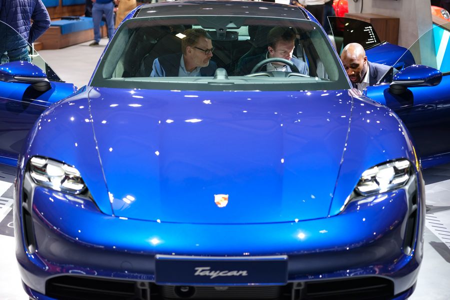 Visitors try a Porsche Taycan car at the 98th Brussels Motor Show in Brussels, Belgium, Jan. 9, 2020.(Xinhua/Zhang Cheng)