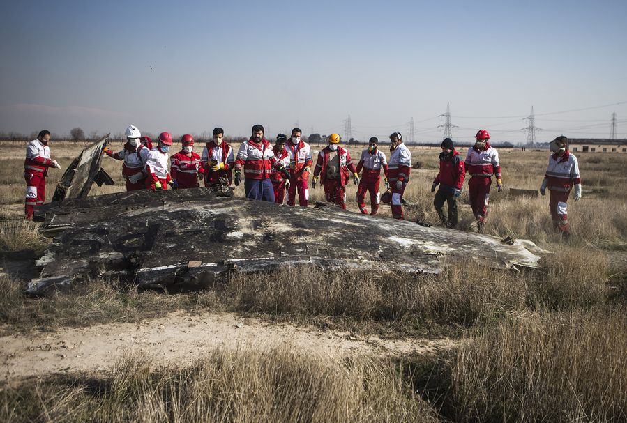 Rescuers work at the air crash site of a Boeing 737 Ukrainian passenger plane in Parand district, southern Tehran, Iran, on Jan. 8, 2020. (Xinhua/Ahmad Halabisaz)