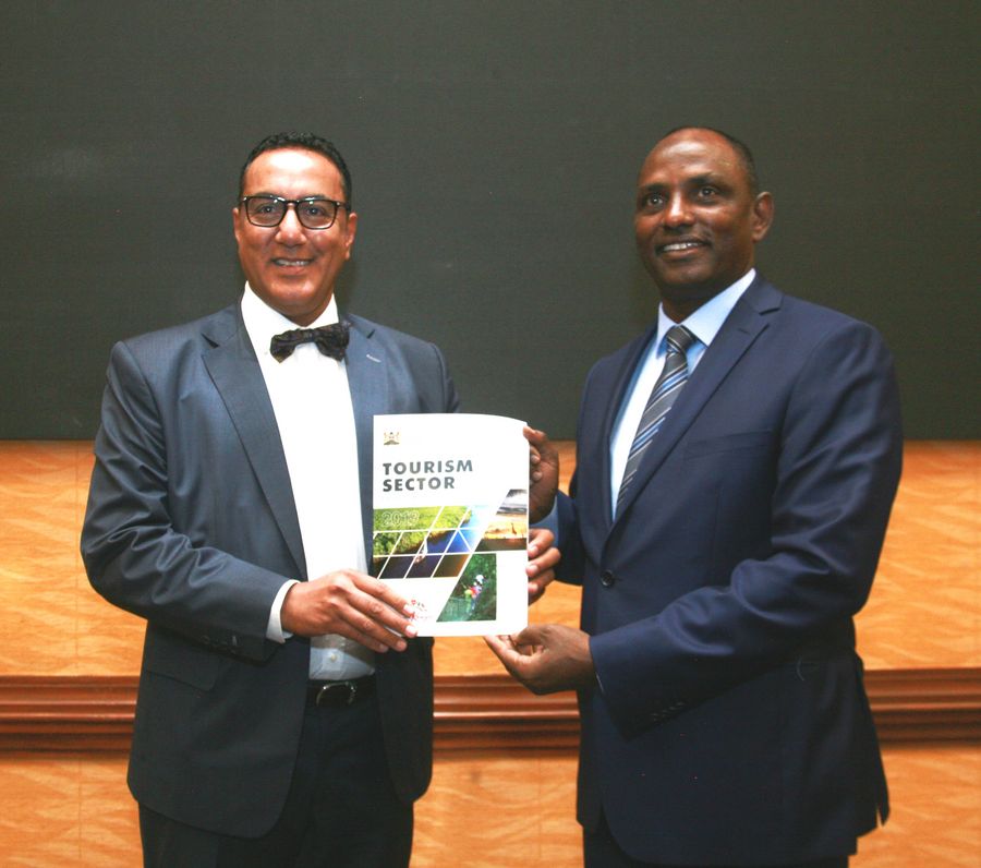 Najib Balala (L), Kenyan Cabinet Secretary in the Ministry of Tourism and Wildlife and Ukur Yattani, acting Finance Cabinet Secretary display a copy of the 2019 Kenyan Tourism Sector Performance report during its launch in Nairobi, capital of Kenya, Jan. 10, 2020. (Xinhua/Charles Onyango)