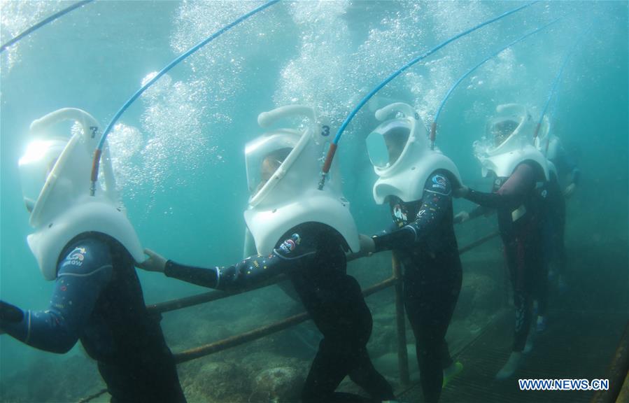 Tourists experience "undersea walking" at the Wuzhizhou Island in Sanya, south China's Hainan Province, Jan. 11, 2020. More than 83 million tourists from home and abroad visited southern China's tropical island province of Hainan in 2019, up nine percent year on year. Hainan's tourism revenue went up 11 percent over the previous year to 105 billion yuan (about 15 billion U.S. dollars) last year, according to the provincial department of tourism, culture, radio, television and sports. (Xinhua/Yang Guanyu)