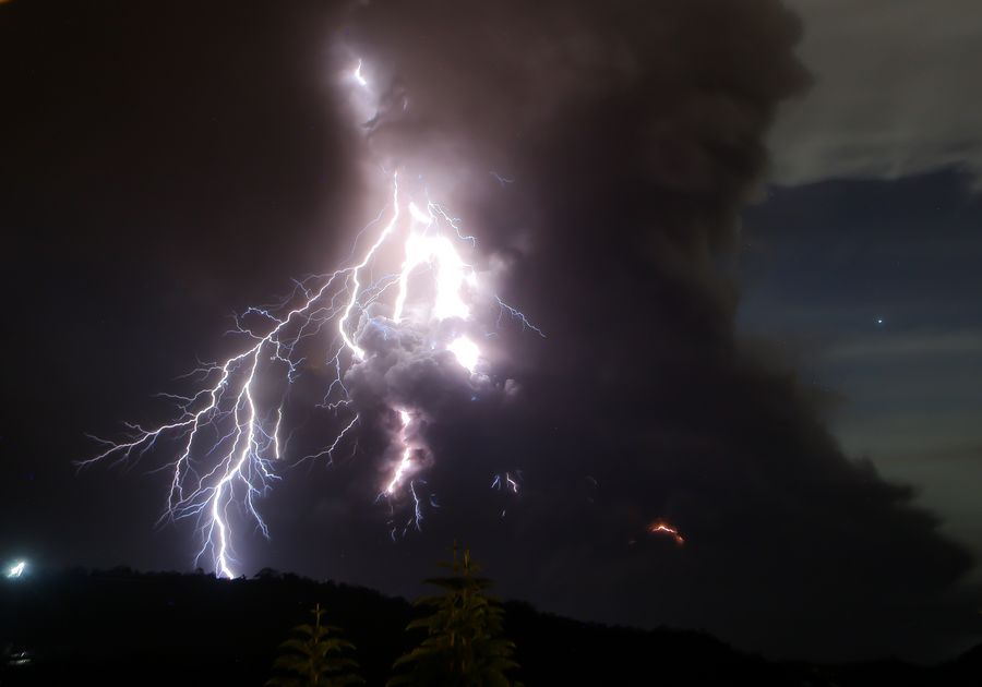 Volcanic lightning lights up the sky as the Taal Volcano erupts in the Philippines, Jan. 12, 2020. (Xinhua/Rouelle Umali)