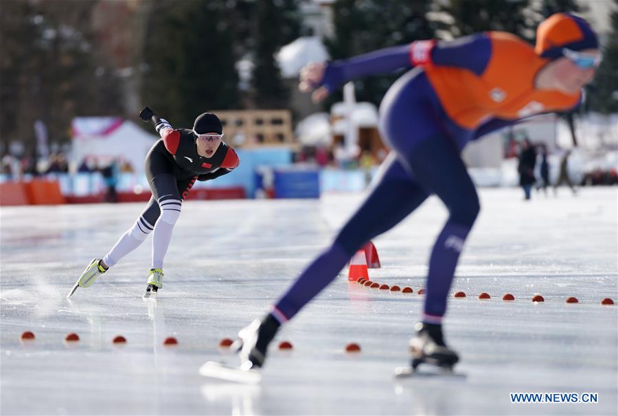 Yang Binyu (L) of China competes during the women's 1500m of speed skating event at the 3rd Winter Youth Olympic Games in St. Moritz, Switzerland, Jan. 13, 2020. (Xinhua/Zhang Chenlin)