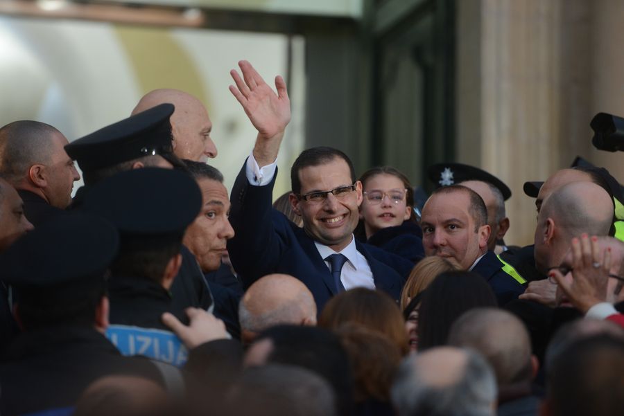 Robert Abela (C) waves to supporters in Valletta, Malta, Jan. 13, 2020. Robert Abela, the newly-elected leader of Malta's Labor Party, was officially sworn in as Prime Minister on Monday at a ceremony at the President's Palace in Valletta. (Photo by Jonathan Borg/Xinhua)