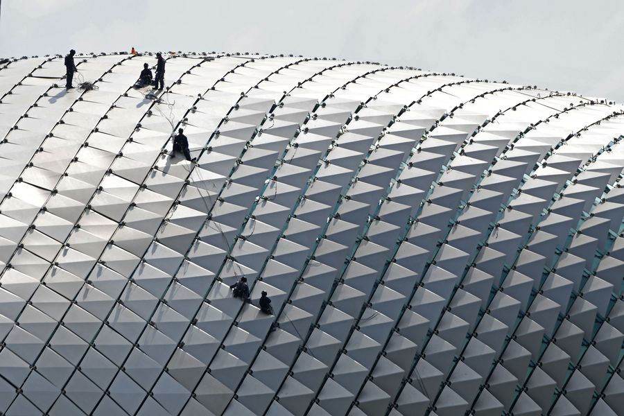 Workers perform maintenance checks on the roof of Singapore's Esplanade on Jan. 13, 2020. (Xinhua/Then Chih Wey)
