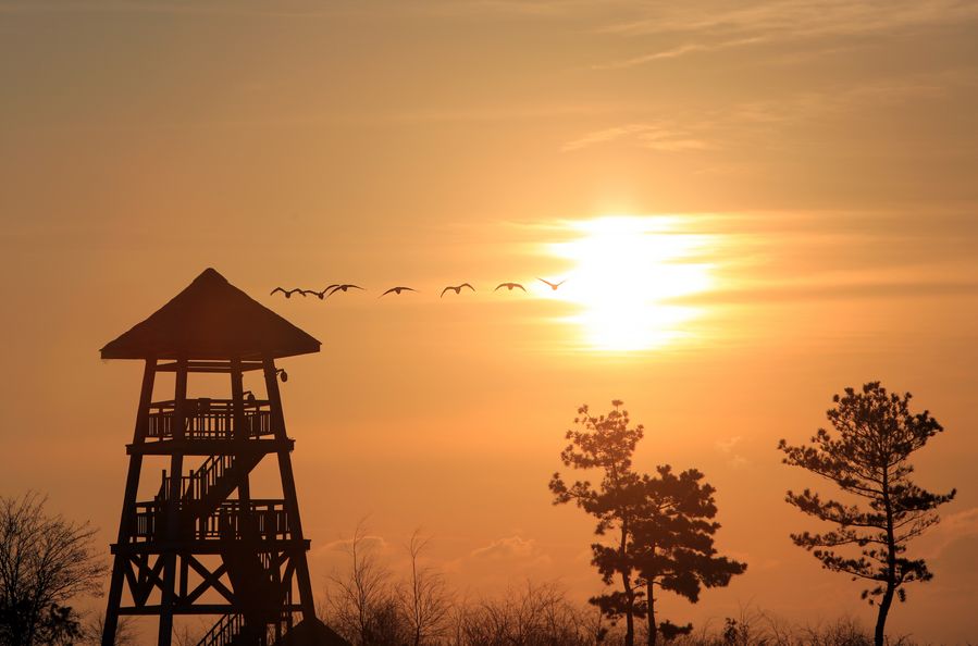 Photo taken on Jan. 9, 2020 shows whooper swans flying in sunrise at the national nature reserve for whooper swans in Rongcheng City, east China's Shandong Province. With unique geographical location and comprehensive ecological protection of wetlands, Rongcheng provides favorable natural conditions for thousands of whooper swans to spend winter. The nature reserve for whooper swans here was established in 1985 and promoted to the state level in 2007. (Xinhua/Sui Xiankai)