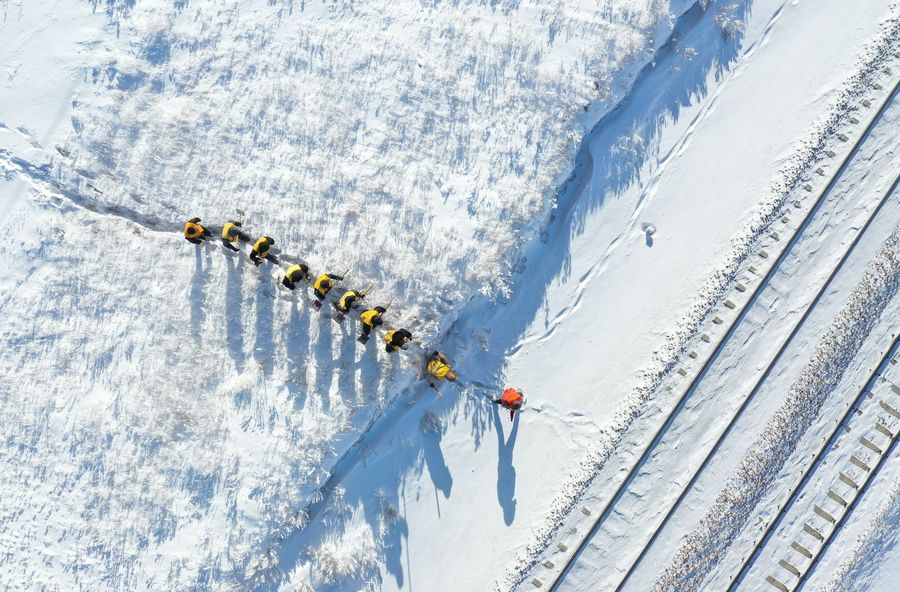 Maintenance men inspect railroads on Xilingol grassland in Xilinhot, north China's Inner Mongolia Autonomous Region, Jan. 13, 2020. (Xinhua/Liu Lei)■