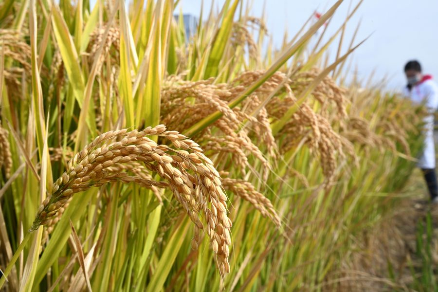 File photo shows a researcher collects rice crop at a demo site. (Xinhua/Li Ziheng)