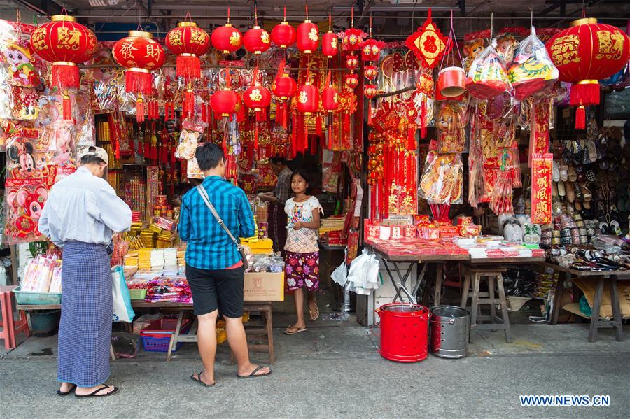 Customers purchase decorations for the upcoming Chinese Lunar New Year in Chinatown of Yangon, Myanmar, Jan. 14, 2020. (Xinhua/Du Yu)