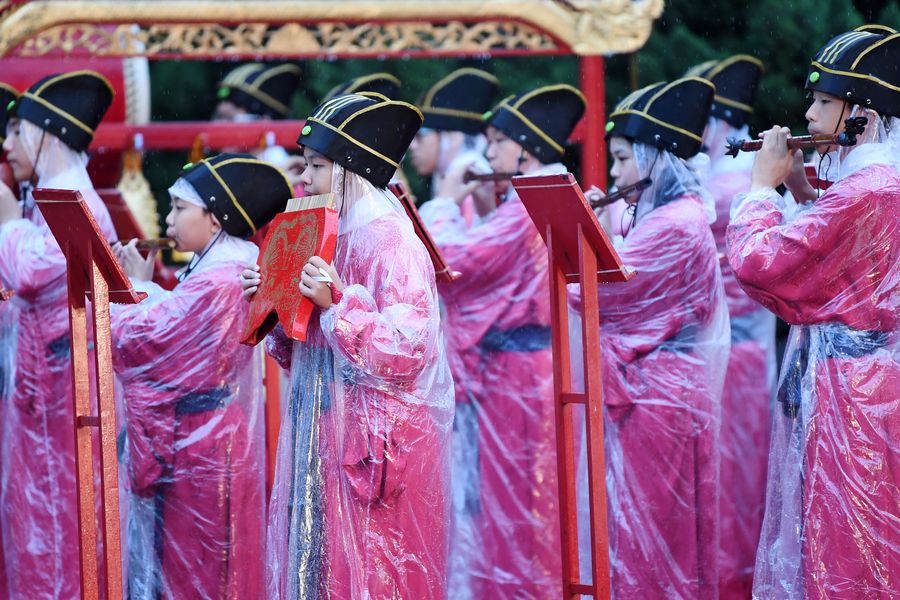 Students play the Chinese traditional instruments during a ceremony marking the 2,570th anniversary of the birth of ancient Chinese sage and educator Confucius at the Confucius Temple in Taipei, southeast China's Taiwan, Sept. 28, 2019. (Xinhua/Chen Bin)