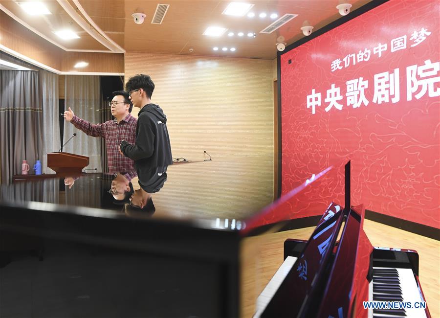 Baritone Zhao Yiluan (L) from China National Opera House instructs students in singing while visiting Shizhu Tujia Autonomous County, southwest China's Chongqing Municipality, Jan. 15, 2020. Artists from China National Opera House have given three lectures on singing and staged five benefit performances for local people in Pengshui, Youyang and Shizhu in three days. (Xinhua/Wang Quanchao)