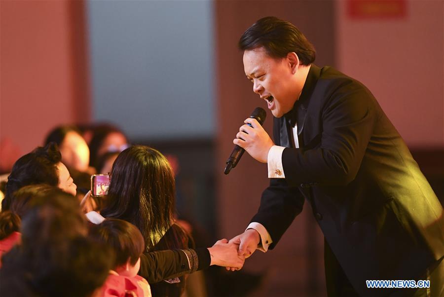 Tenor Xu Sen from China National Opera House interacts with the audience during a benefit performance in Pengshui Miao-Tujia Autonomous County, southwest China's Chongqing Municipality, Jan. 12, 2020. Artists from China National Opera House have given three lectures on singing and staged five benefit performances for local people in Pengshui, Youyang and Shizhu in three days. (Xinhua/Wang Quanchao)