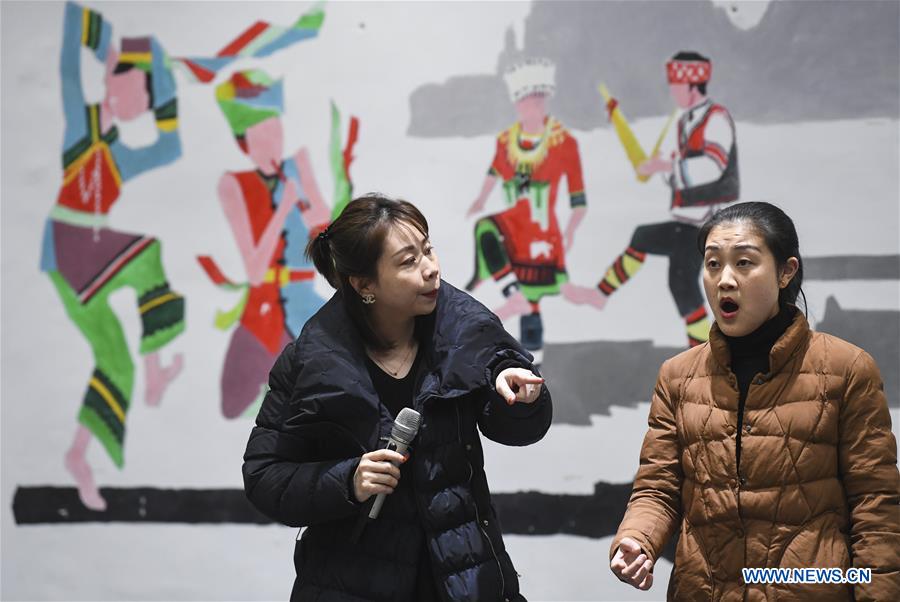 Soprano Xia Yu (L) from China National Opera House instructs a student in singing during a lecture in Pengshui Miao-Tujia Autonomous County, southwest China's Chongqing Municipality, Jan. 12, 2020. Artists from China National Opera House have given three lectures on singing and staged five benefit performances for local people in Pengshui, Youyang and Shizhu in three days. (Xinhua/Wang Quanchao)