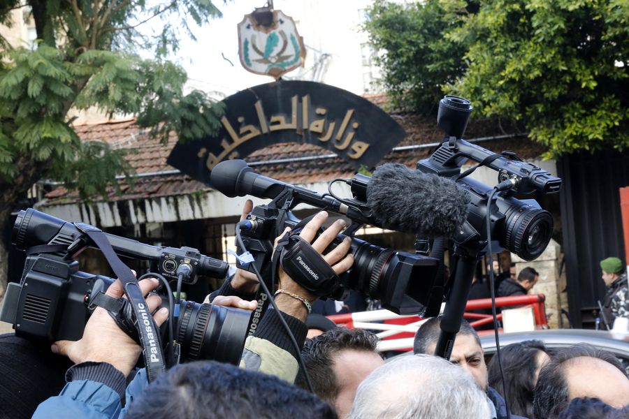 A sit-in by journalists was held in front of the Interior Ministry in Beirut, Lebanon, on Jan. 16, 2020, to protest the attacks by security forces on the press covering the protests a day before. (Xinhua/Bilal Jawich)