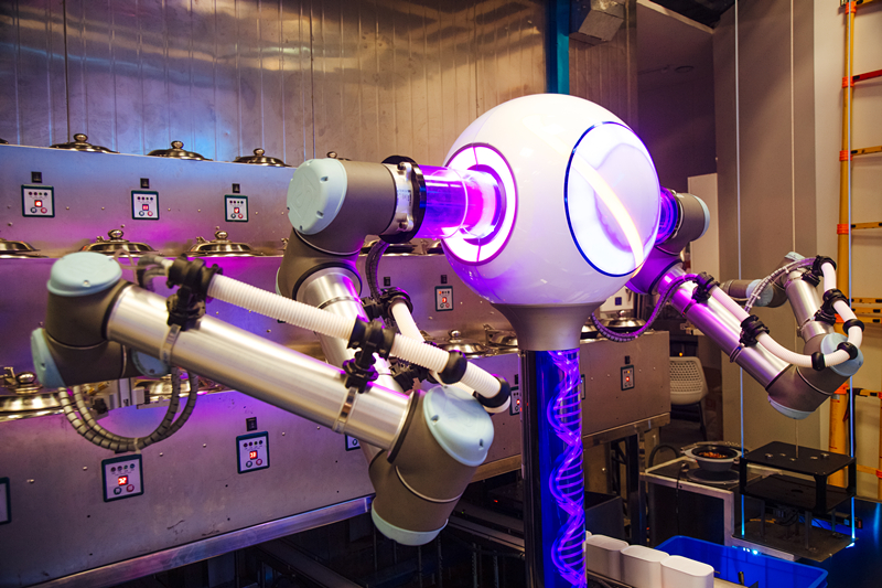 Customers place their orders using a touch-screen device inside the restaurant. Then an ingredient delivery system collects the ingredients and portions them, before delivering them into 32 robotic woks.