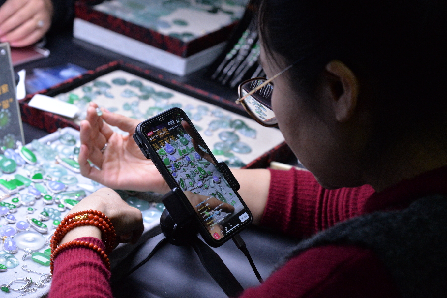 "This pair of well-crafted earrings has a pure green color and good transparency. It fits fair skin. The seller is asking for 8,000 yuan (about 1,160 U.S. dollars)," said livestreamer Luo Yaying in the market to her viewers via a smartphone.