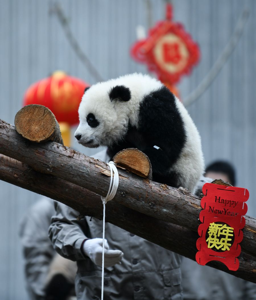 In a festively decorated area of the base, the cubs, each held by their own keeper, are pictured in the atmosphere of the upcoming Chinese Lunar New Year.
