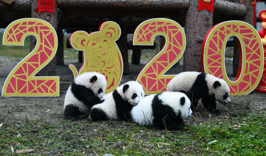 Photo taken on Jan. 17, 2020 shows giant panda cubs born in 2019 at Shenshuping base of China Conservation and Research Center for Giant Pandas in Wolong National Nature Reserve, southwest China's Sichuan Province. (Xinhua/Tang Wenhao)