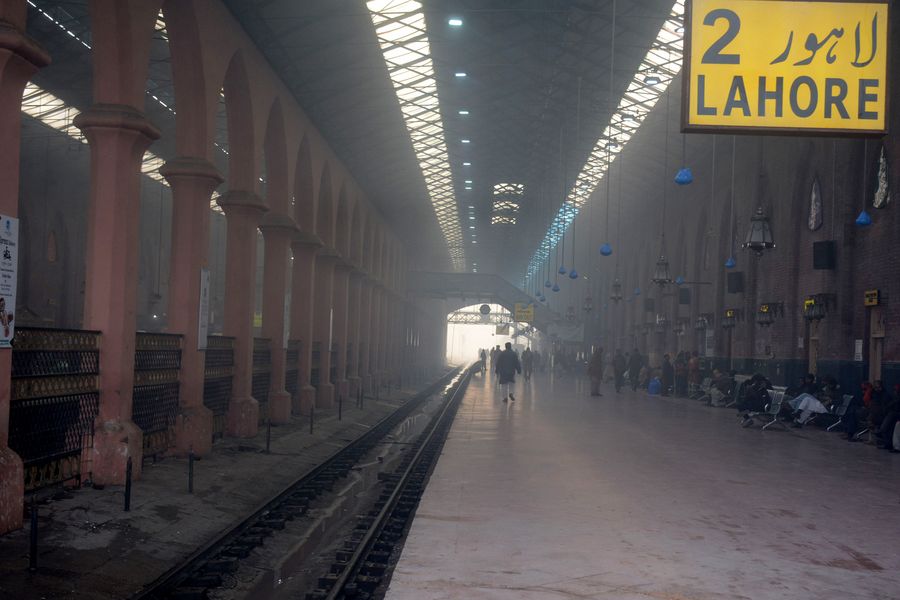 Passengers wait for trains at a railway station amidst dense fog in eastern Pakistan's Lahore on Jan. 17, 2020. (Xinhua/Sajjad)