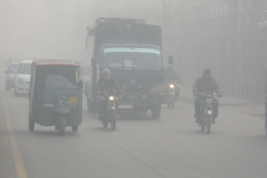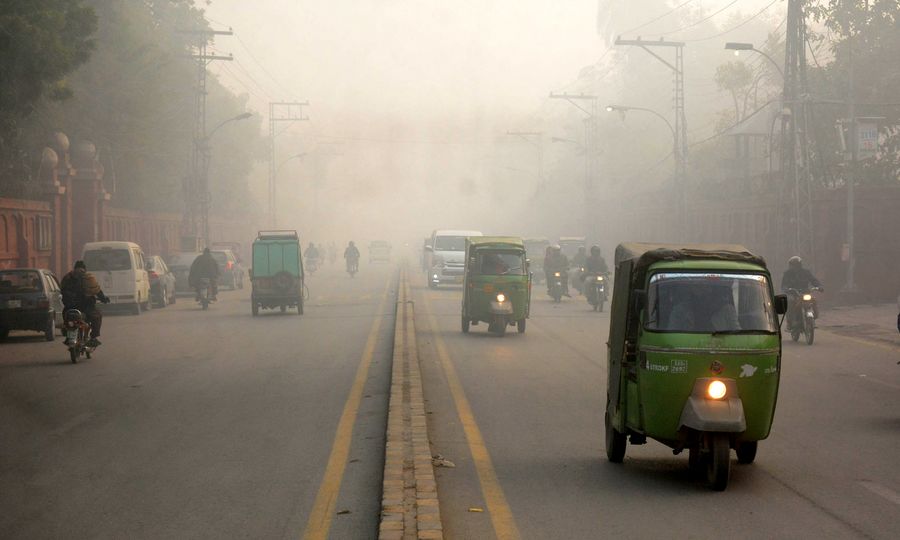 Vehicles move on the road amidst dense fog in eastern Pakistan's Lahore on Jan. 17, 2020. (Xinhua/Sajjad)