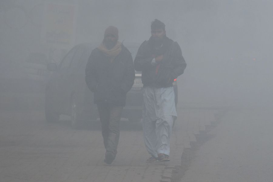 People walk on a road amidst dense fog in eastern Pakistan's Lahore on Jan. 17, 2020. (Xinhua/Sajjad)