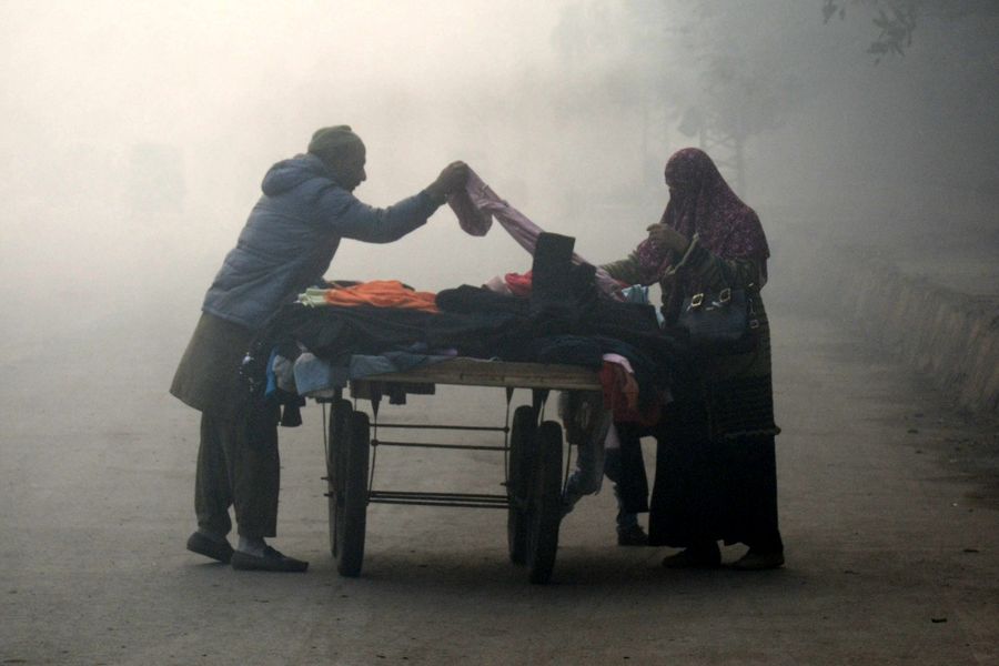 A vendor shows clothes to a customer amidst dense fog in eastern Pakistan's Lahore on Jan. 17, 2020. (Xinhua/Sajjad)