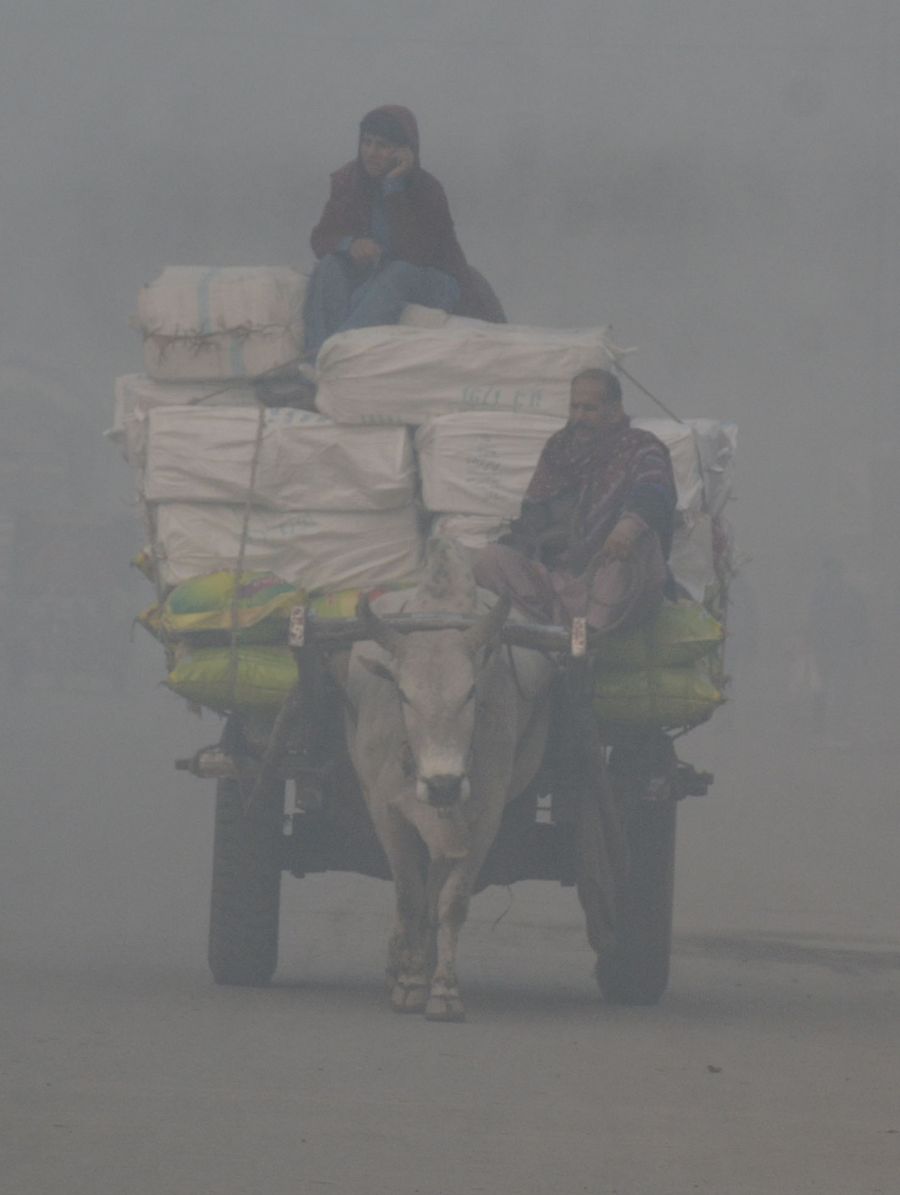 Laborers ride on a bullock cart amidst dense fog in eastern Pakistan's Lahore on Jan. 17, 2020. (Xinhua/Sajjad)■