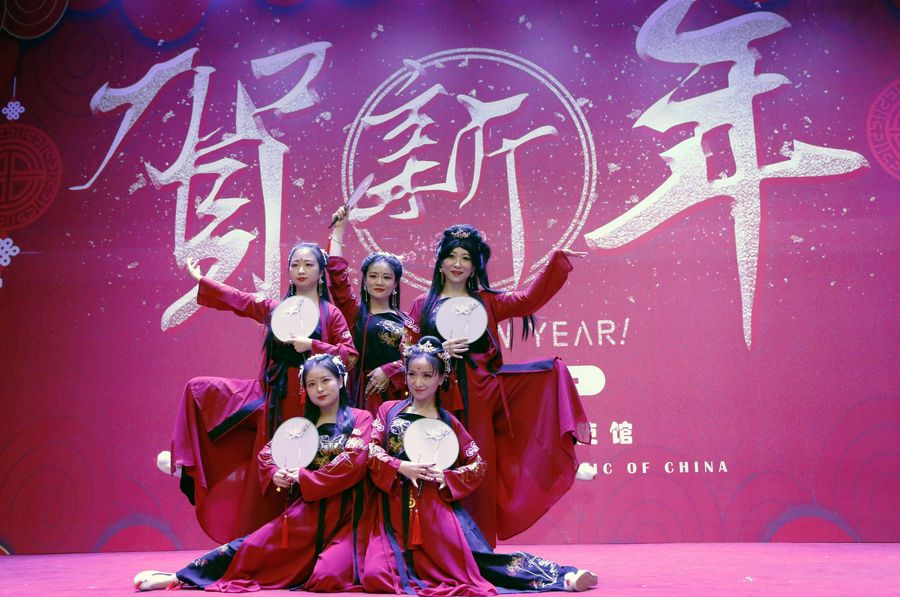 Performers dance at the reception held by the Chinese embassy in Pakistan to celebrate the forthcoming Chinese Lunar New Year in Islamabad, capital of Pakistan, Jan. 18, 2020. (Photo by Ahmad Kamal/Xinhua)