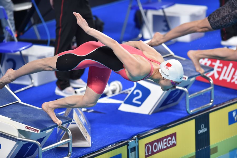 Chinese swimmer Liu Xiang sets off into the pool at the women's 50m free final at the FINA Champions Swim Series in Beijing on Jan. 19. (Xinhua)