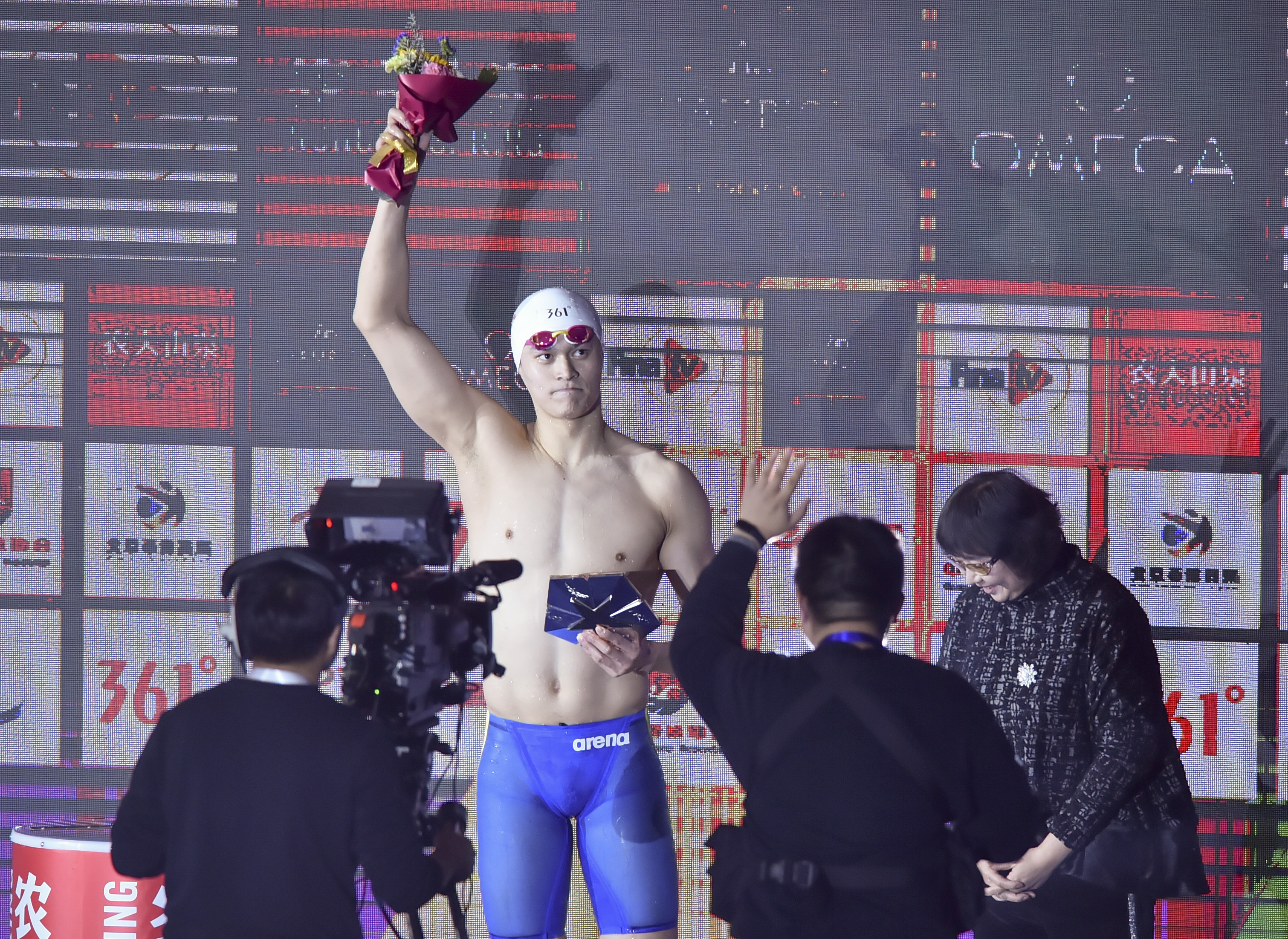 Chinese simmer Sun Yang is on the podium for award ceremony after winning the 400m free at the FINA Champions Swim Series in Beijing on Jan. 19. (Xinhua)