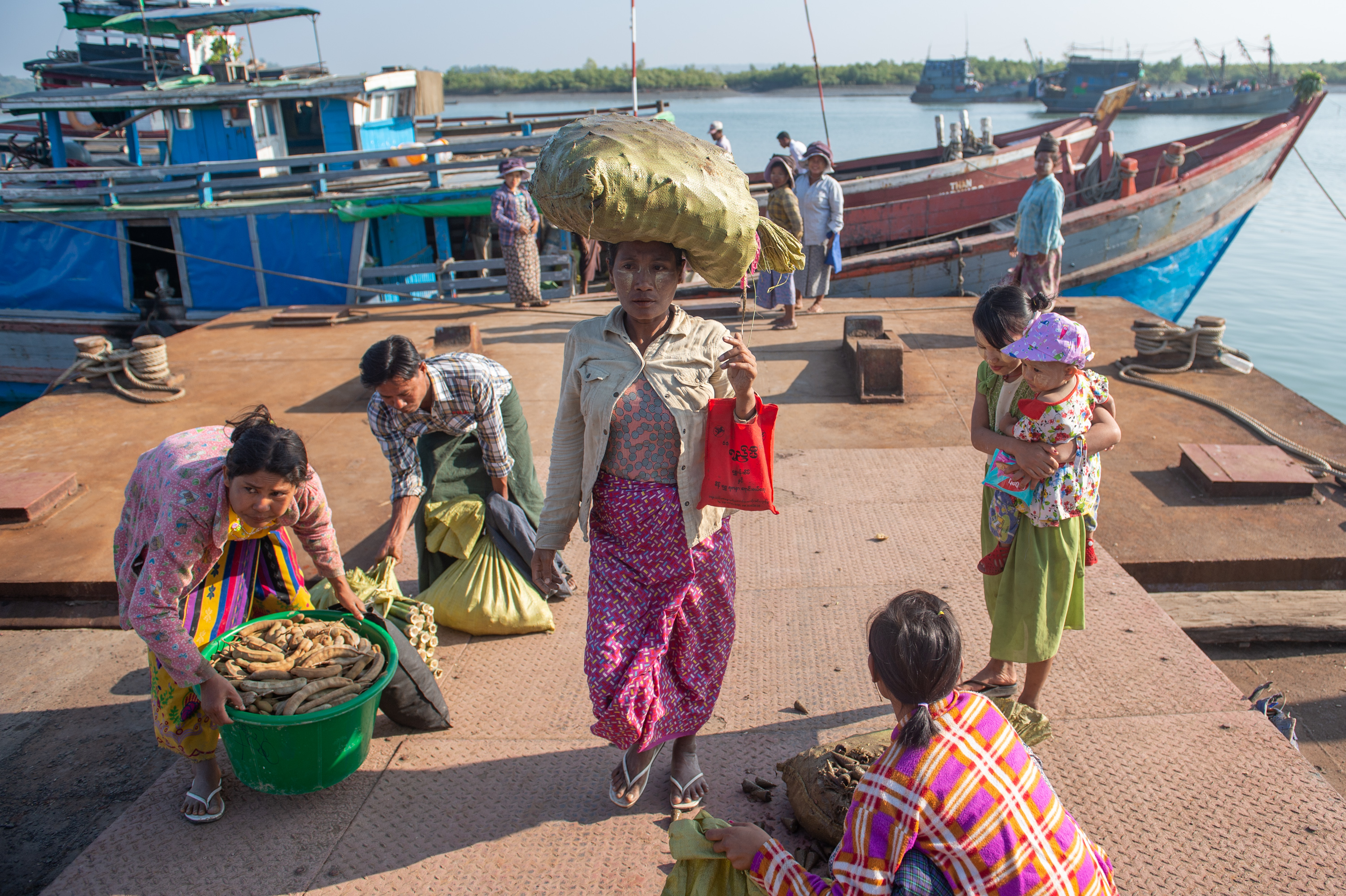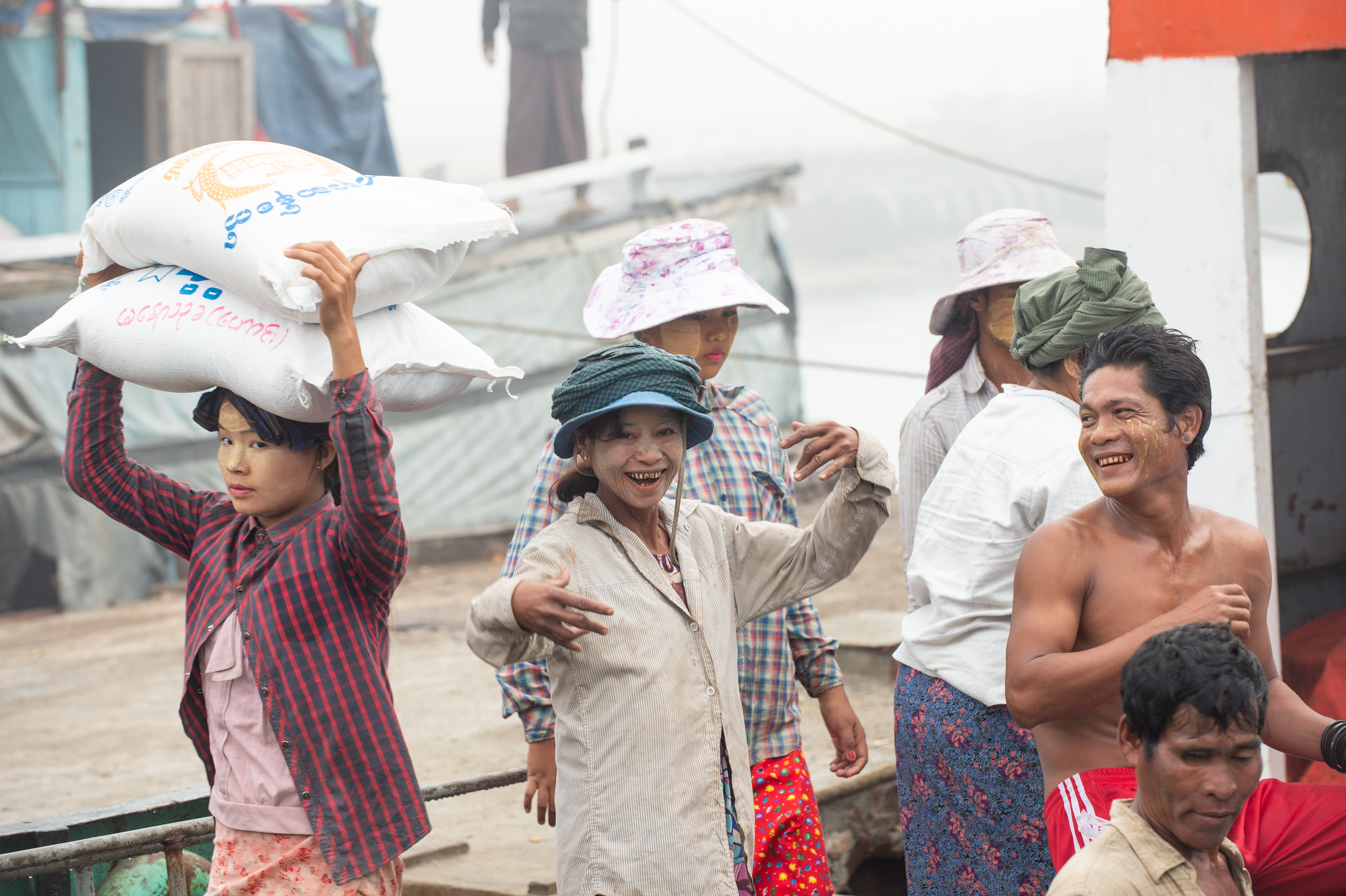 Female laborers unload goods from cargo ship at a pier in Kyaukpyu, Rakhine State, Myanmar, Jan. 13, 2020. (Xinhua/Du Yu)
