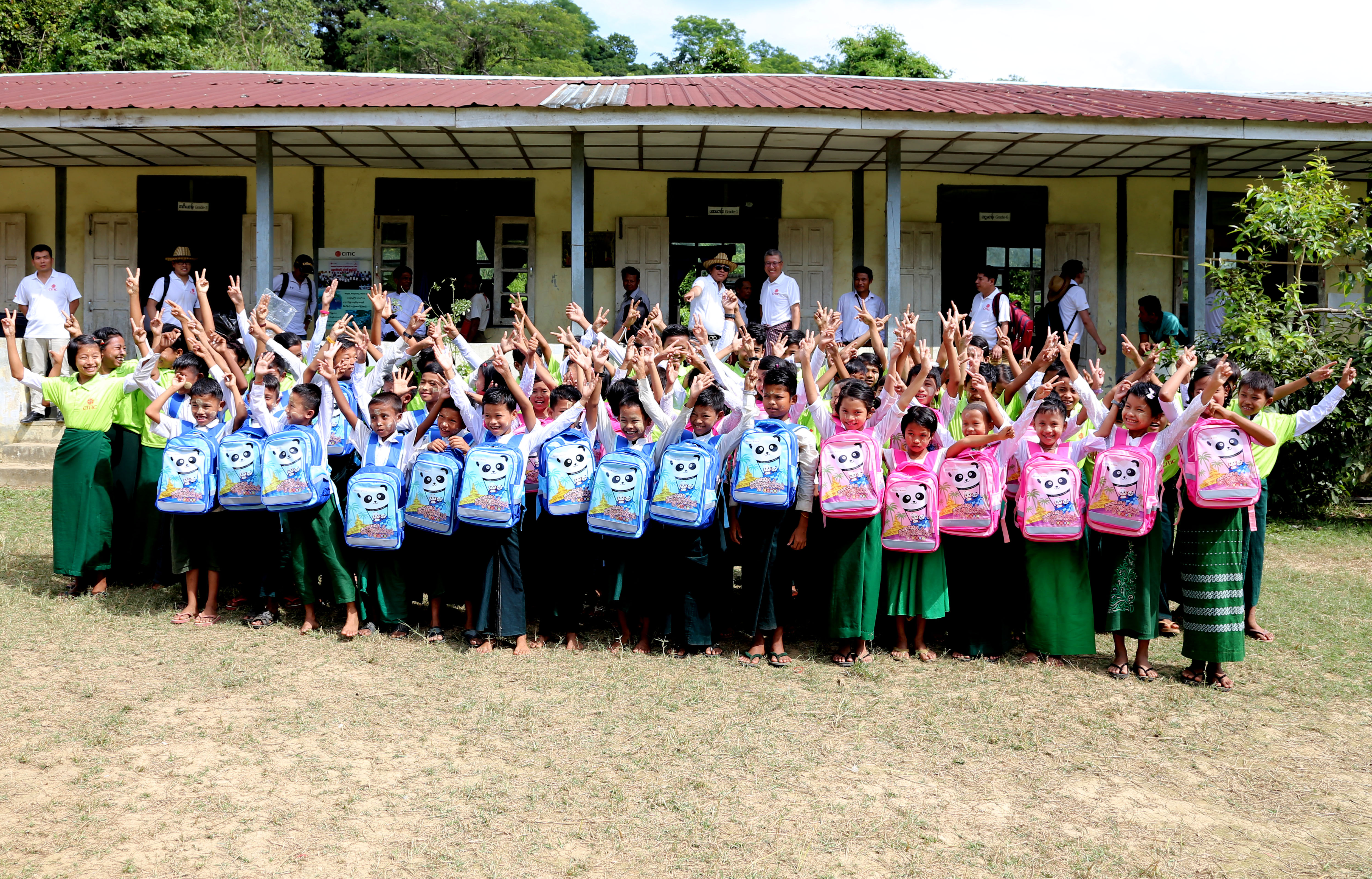 Students carrying school bags with panda images pose for a group photo during the donation ceremony led by the China International Trust and Investment Corporation (CITIC) Consortium in Kyaukphyu township of Rakhine state, Myanmar, Nov. 7, 2019. (Photo by Soe Moe Oo/Xinhua)