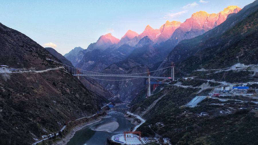 Aerial photo taken on Jan. 20, 2020 shows the construction site of the Tiger Leaping Gorge Jinsha River Bridge in southwest China's Yunnan Province.(Xinhua/Wu Han)