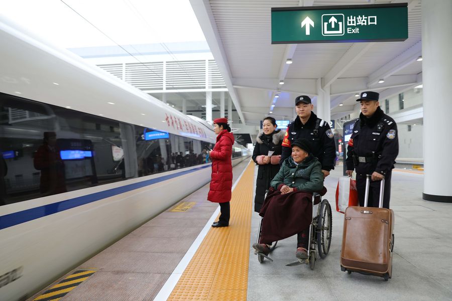 Policemen escort a senior passenger to get aboard a bullet train at Fuyang West Station in Fuyang, east China's Anhui Province, Jan. 10, 2020. (Xinhua/Cao Li)