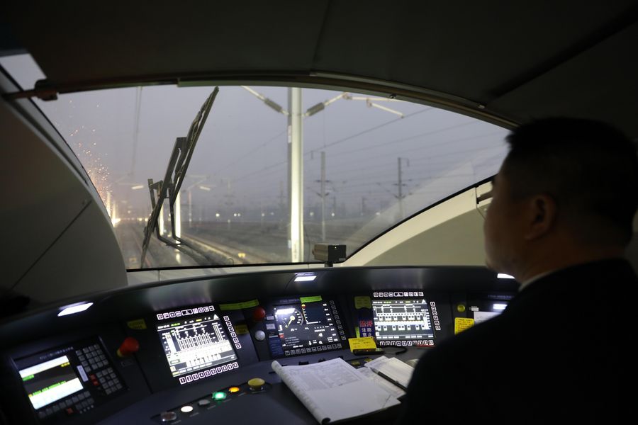 A crew member checks the condition of the bullet train G7787 heading for Hongqiao Railway Station, east China's Shanghai, at Fuyang West Station in Fuyang, east China's Anhui Province, Dec. 1, 2019. (Xinhua/Cao Li)