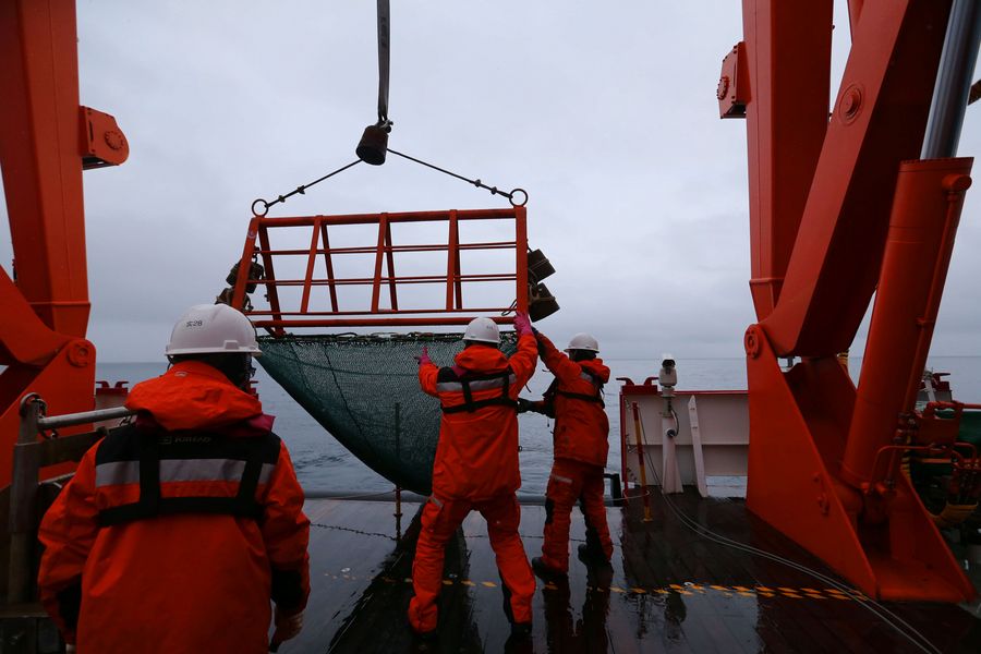 Members of China's 36th Antarctic expedition team drop a trawl to collect benthos samples aboard China's polar icebreaker Xuelong 2, or Snow Dragon 2, Jan. 7, 2020. (Xinhua/Liu Shiping)